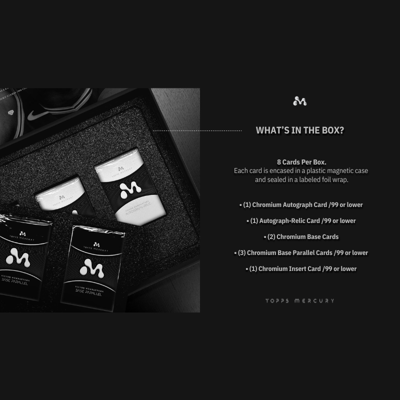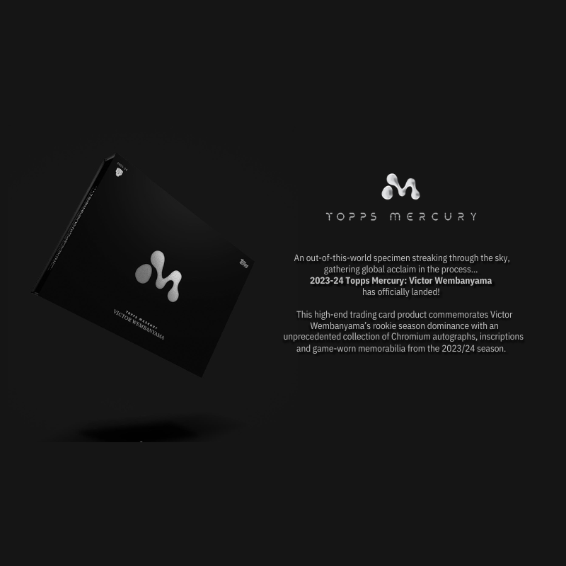 The 2023/24 Topps Mercury Victor Wembanyama Basketball Box is an exclusive, must-have product for basketball fans and collectors focused on the most hyped rookie of the year, Victor Wembanyama. This box is dedicated entirely to the generational talent, showcasing his early career with dynamic designs and high-quality card stock. Each box includes a variety of parallels, refractors, and rare inserts, including autographs and limited-edition cards featuring Wembanyama in action. With its sleek presentation and emphasis on one of the NBA's most exciting young stars, the Topps Mercury box is perfect for those wanting a piece of basketball history in the making.