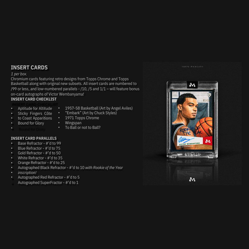 - Chromium cards featuring retro designs from Topps Chrome and Topps Basketball along with original new subsets. All insert cards are numbered to /99 or less, and low-numbered parallels - /10, /5 and 1/1 – will feature bonus on-card autographs of Victor Wembanyama!