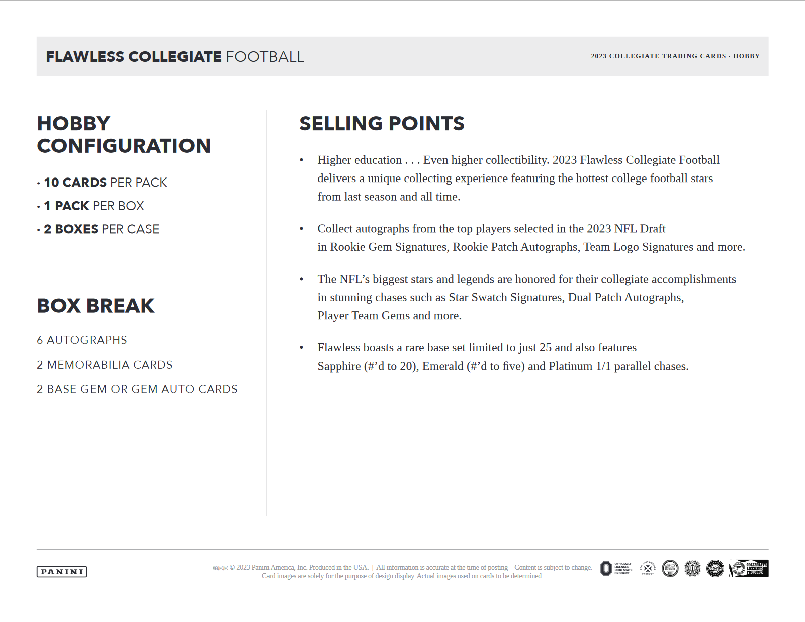- Higher education . . . Even higher collectibility. 2023 Flawless Collegiate Football delivers a unique collecting experience featuring the hottest college football stars from last season and all time.
