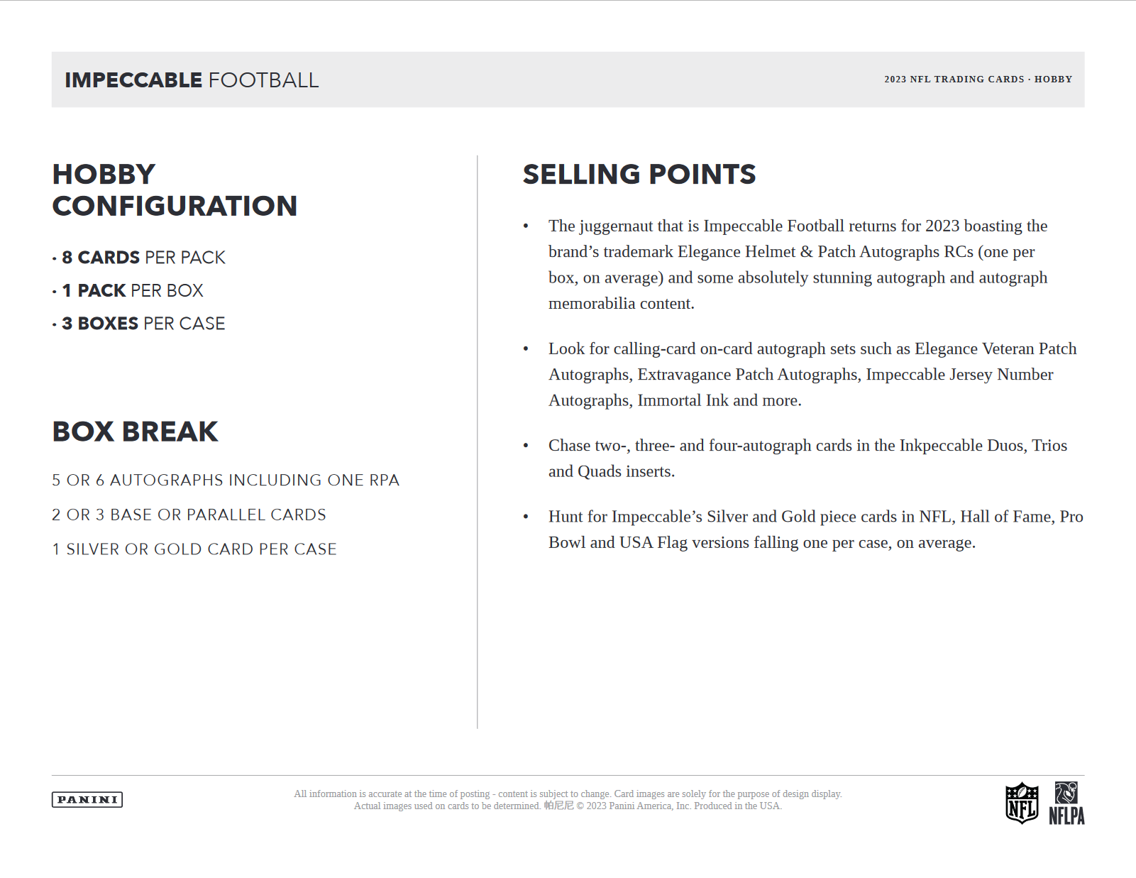 - The juggernaut that is Impeccable Football returns for 2023 boasting the brand’s trademark Elegance Helmet & Patch Autographs RCs (one per box, on average) and some absolutely stunning autograph and autograph memorabilia content.