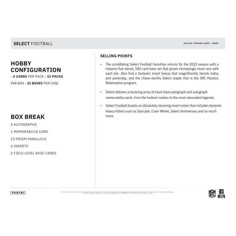 - The scintillating Select Football franchise returns for the 2023 season with a massive five-tiered, 500-card base set that grows increasingly more rare with each tier. Also find a fantastic insert lineup that magnificently blends today and yesterday, and the chase-worthy Select staple that is the XRC Mystery Redemption program.