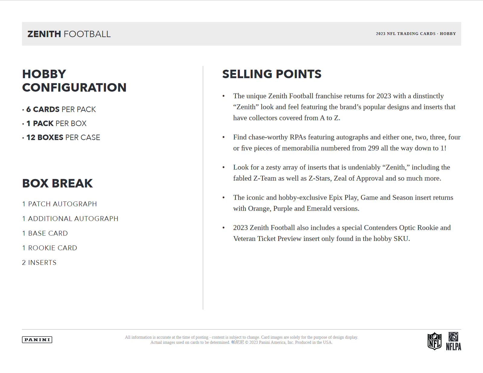 - The unique Zenith Football franchise returns for 2023 with a dinstinctly “Zenith” look and feel featuring the brand’s popular designs and inserts that have collectors covered from A to Z.