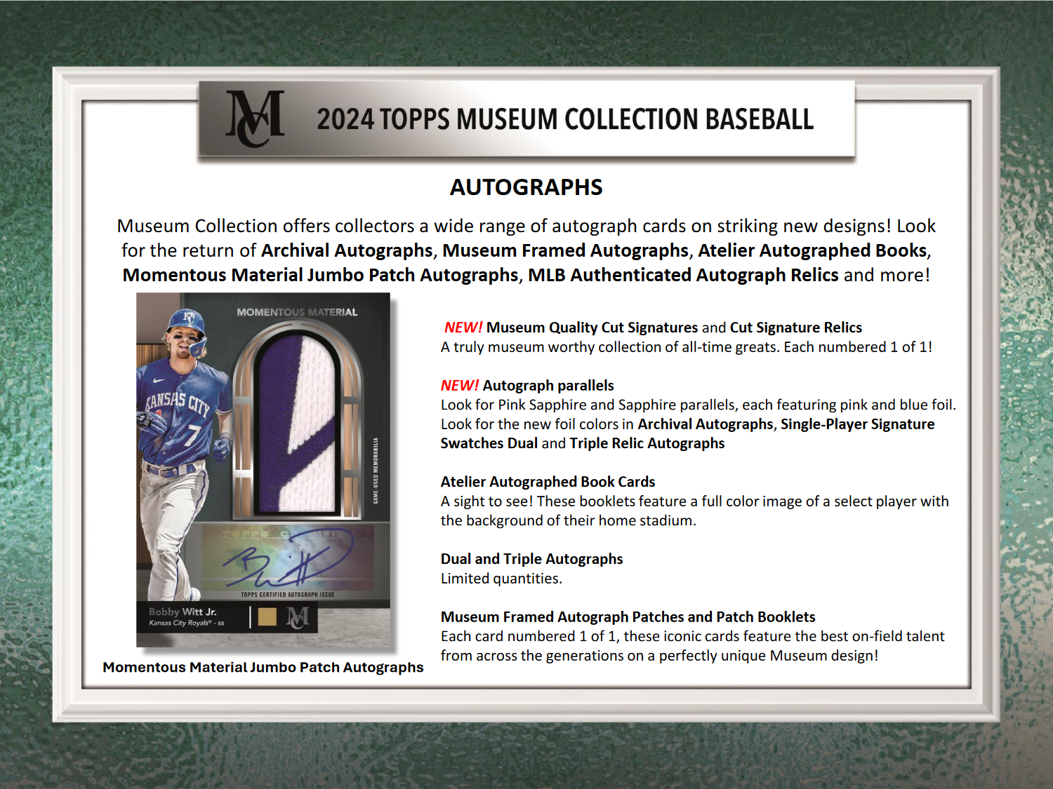 - Museum Collection offers collectors a wide range of autograph cards on striking new designs! Look for the return of Archival Autographs, Museum Framed Autographs, Atelier Autographed Books, Momentous Material Jumbo Patch Autographs, MLB Authenticated Autograph Relics and more!