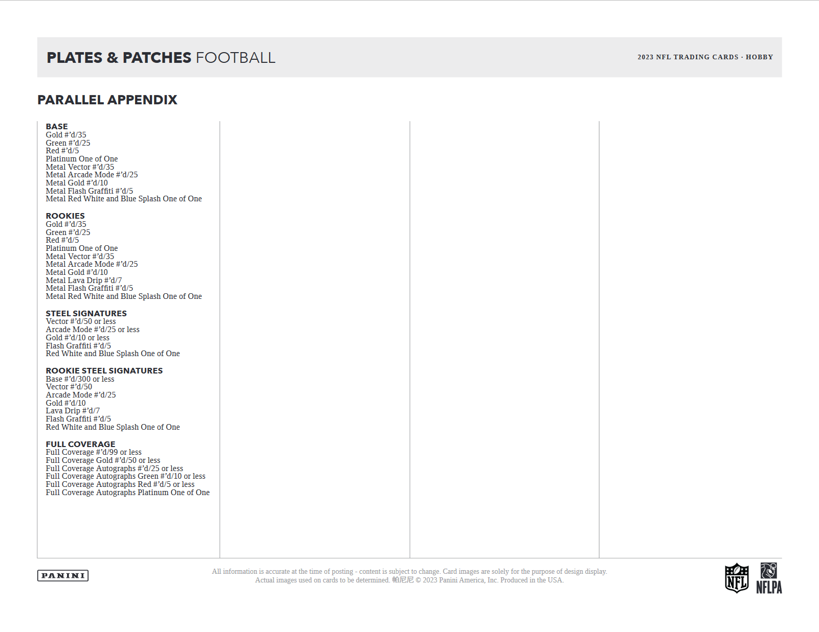 - Plates & Patches returns to the Panini lineup featuring all-new Steel Signatures on metal, as well as base parallels on metal!